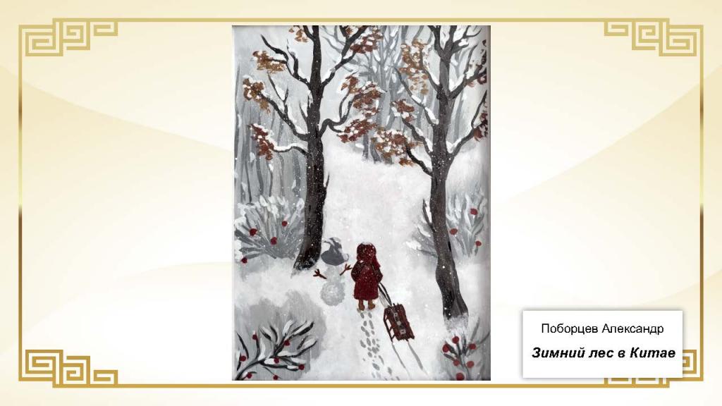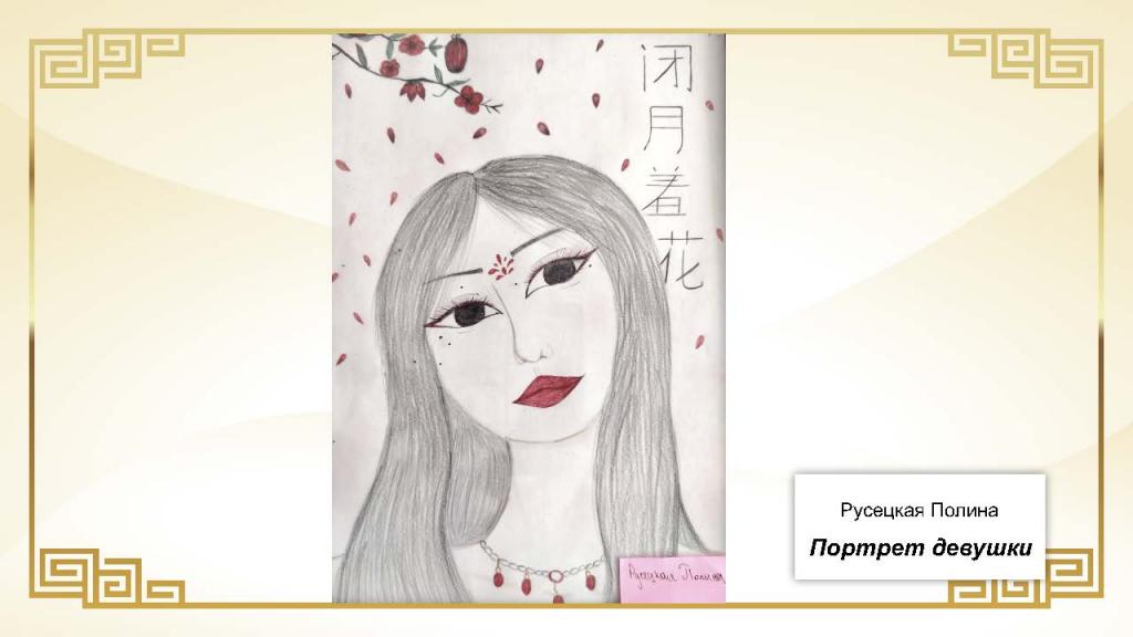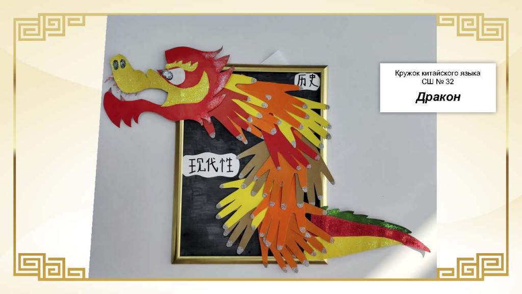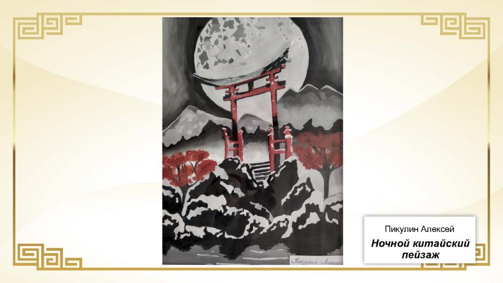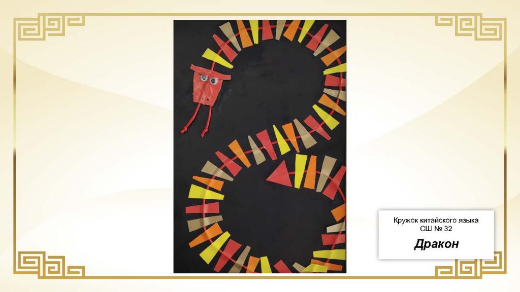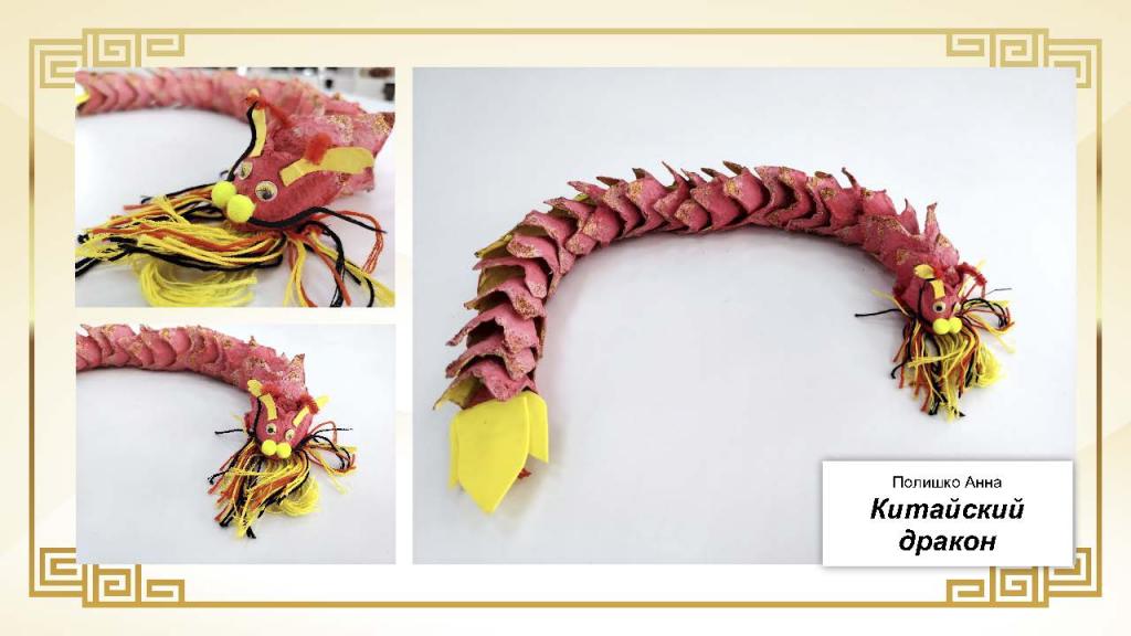 Всего на конкурс было представлено 37 работ. Основу экспозиции составили живописные и графические произведения, выполненные в различных техниках — от карандашного рисунка и акварели до гуаши. Значительное место заняли декоративно-прикладные работы: изображения китайского дракона в форме рисунков, аппликаций и скульптур, а также традиционные мотивы китайской архитектуры, в том числе пагоды из бумаги и дерева.